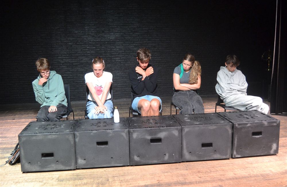 De avond ging van start met de voorstelling van de afdeling Oudsbergen. Drie leerlingen kozen voor het indringende familiedrama Lijk van Esther Gerritsen. Toen één van hen onverwacht afhaakte kort voor de voorstelling, dreigde het stuk letterlijk in het water te vallen. Maar de overgebleven actrices zetten door. Met de hulp van een leerlinge uit de derde graad, die dapper inviel en haar rol voorlas op scène, brachten ze het verhaal toch tot leven. En hoe! De spanning was voelbaar, de personages levensecht en de geladen sfeer – rond een mysterieus graf in de achtertuin – werd met overtuiging neergezet. Het publiek werd meegesleurd in een verhaal vol vragen en onderhuidse dreiging. Een moedige en sterke prestatie die indruk maakte.