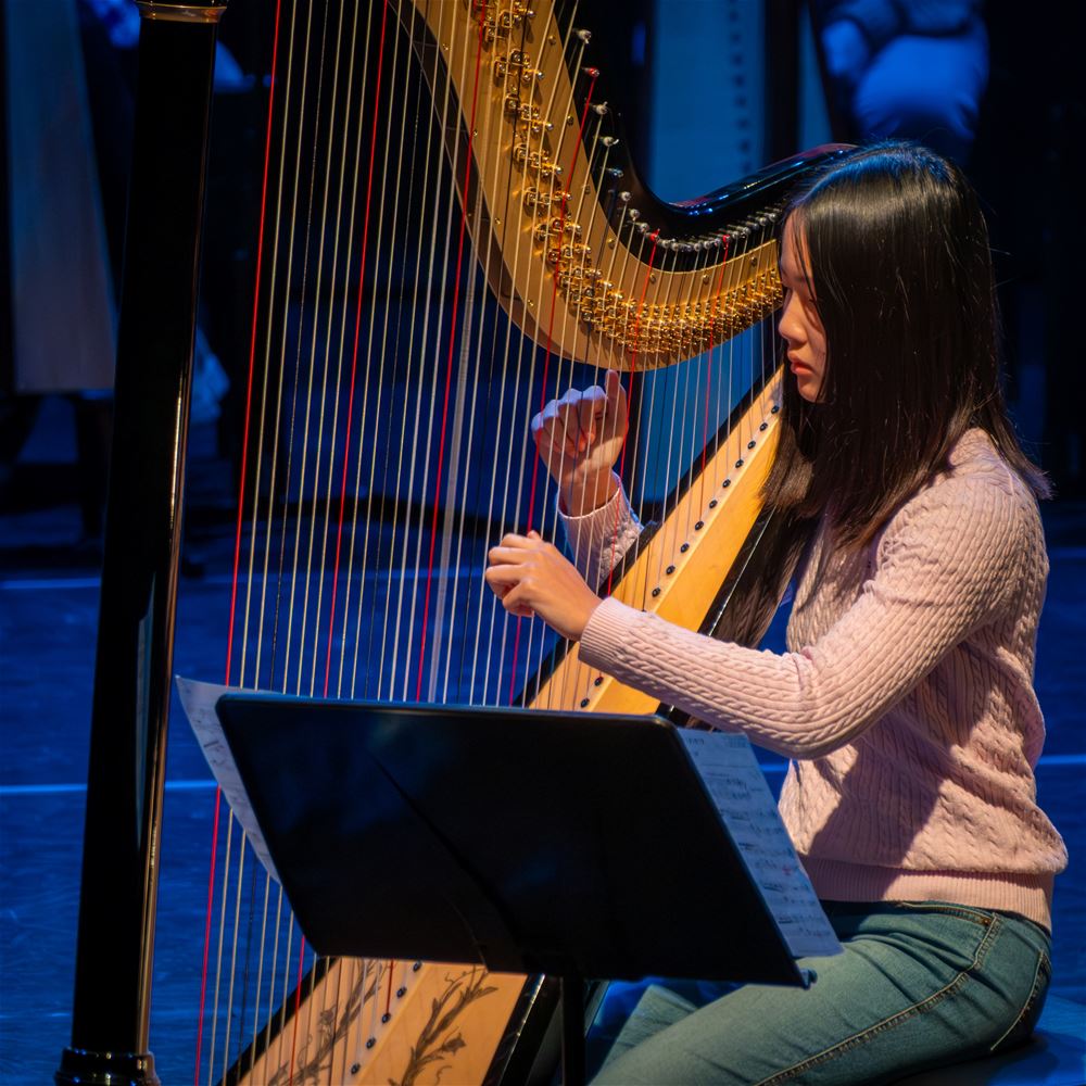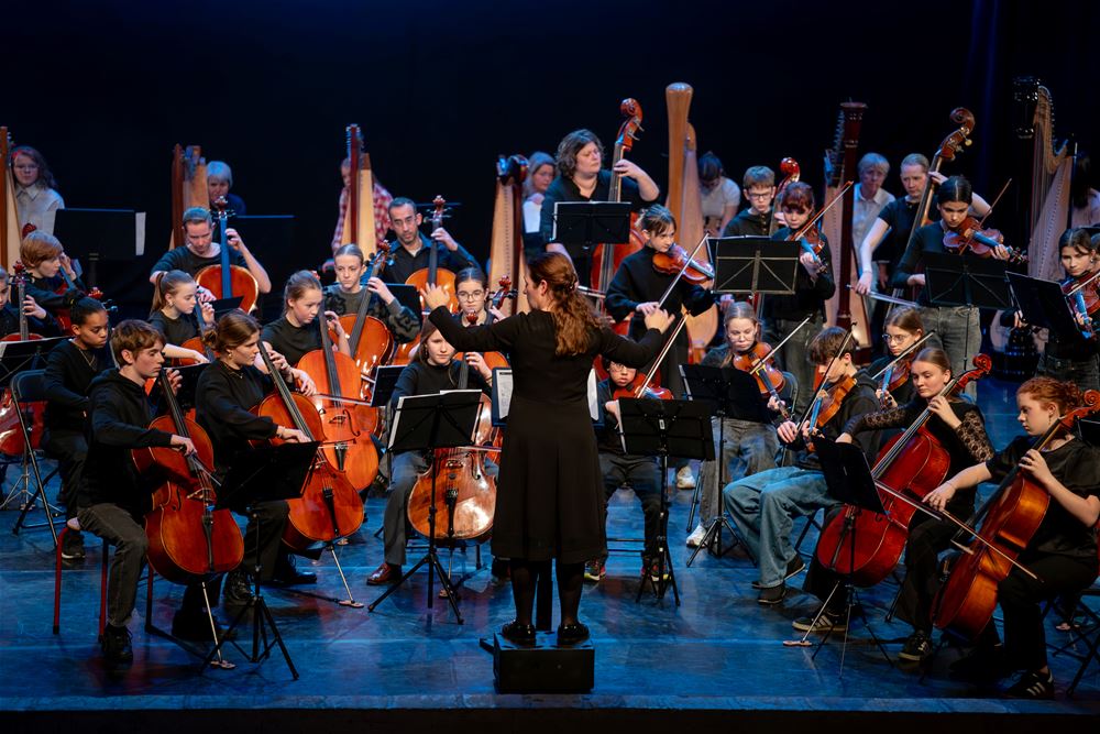 Muzikaal kleurde de avond verder nog in verschillende tinten. Het harpensemble (2e, 3e, 4e graad) o.l.v. Bianca Tabois betoverde met een rijke en volle klank. Op solo-harp bracht Lien Yunshu Yang “Sérénade mélancolique” van A. Hasselmans teder en precies, met een mooie adem in de frasering.