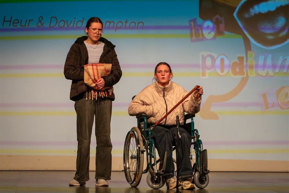 Het publiek nam plaats tussen deze twee podia en werd verwelkomd door theaterdocent Wouter Fimmers. Hij gaf al snel het woord door aan schepen Lieve Dierickx. Daarna volgden de optredens elkaar aan weerskanten in een vlot maar aangenaam tempo op.
