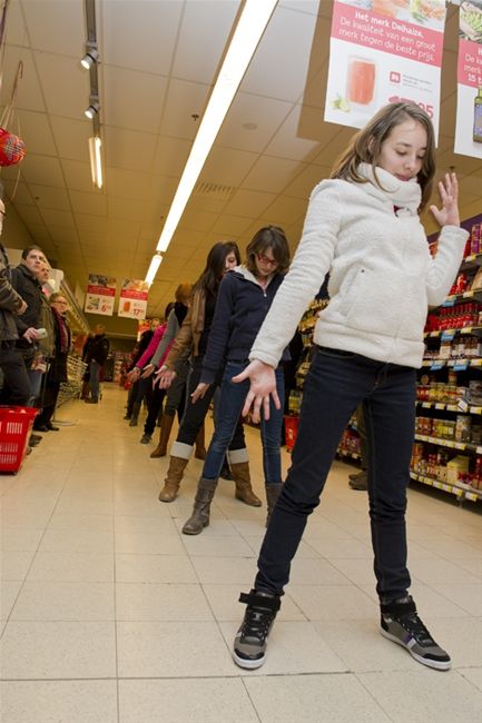 Voor diegenen die ‘nog niet mee zijn met de tijd’: een flashmob is een groep mensen die op een openbare plek opduikt, daar iets ongebruikelijks doet en daarna weer snel uiteenvalt. De leerlingen woord van het NIKO waren te horen via het omroepsysteem van de betrokken winkel. Het saxofoonensemble zorgde voor de muziek en de dansafdeling overviel de toevallige klanten met een ingestudeerde dans tussen de winkelrekken.