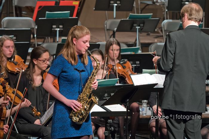 Tijdens een drukbezocht concert om 15.00 uur in de concertzaal van CC Achterolmen, traden 6 eerder geselecteerde solisten op met het Limburgs symfonisch orkest Jeugd en Muziek. Onder hen ook 2 schitterende leerlingen uit onze Kunstacademie Noord-Limburg: