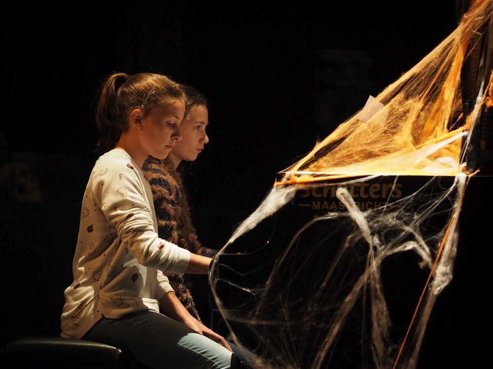 Voor een volle zaal zongen demonische duivels, rammelende geraamtes en ander heksengebroed uit de AMV-klassen de griezeligste liedjes. Moedige muzikanten namen plaats tussen het spinnenrag en betoverden het publiek met duistere melodieën. Onbevreesde leerlingen theater vertelden en speelden enkele spannende spookverhalen.
