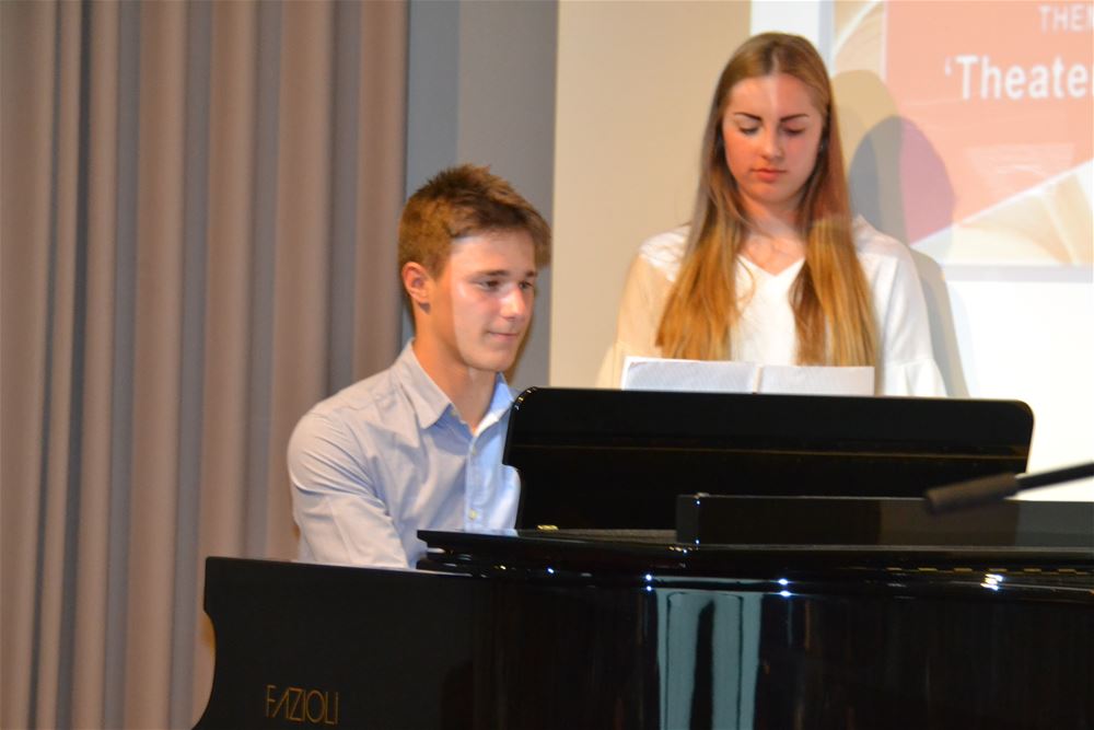 De presentatie was in handen van Jade Mollace, leerling theater. Karen Jansen, Rik Luykx en Waïl Toufalla, leerlingen piano, zorgden voor een streepje muziek. Een fijne, kunstzinnige samenwerking!