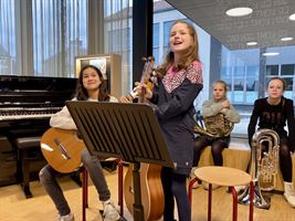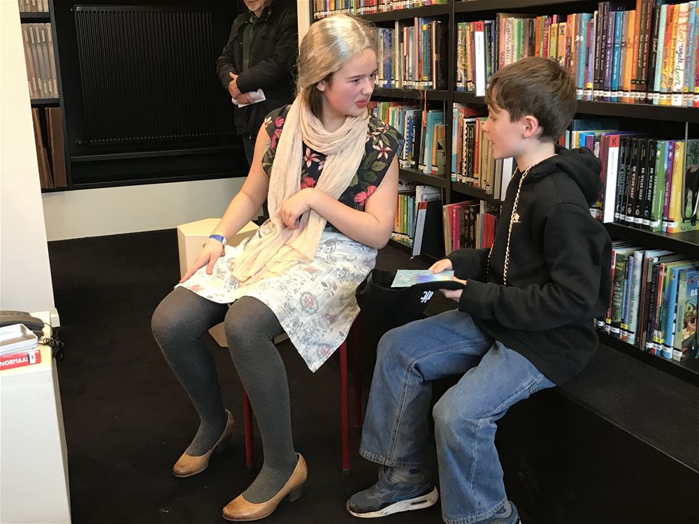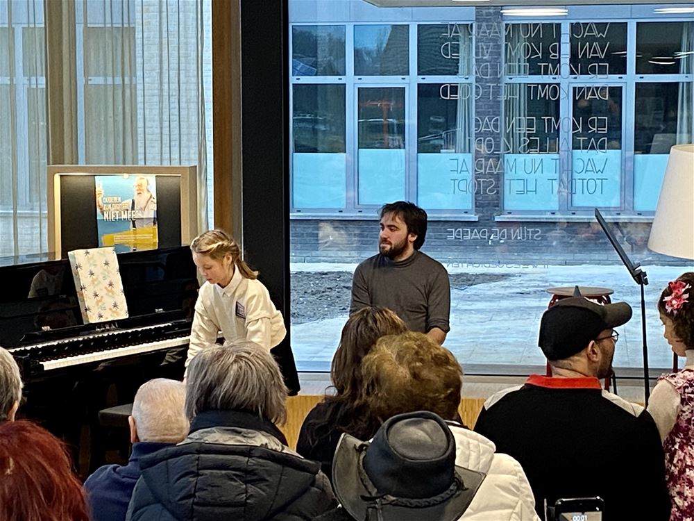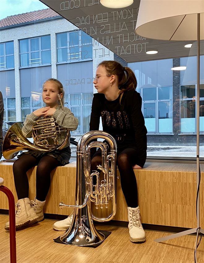 Tussen de boekenrekken wisselden korte optredens met gitaar, piano, harp, accordeon, viool, cello, dwarsfluit, hoorn, trompet, tuba en trombone af met korte scènes door de leerlingen theater.