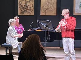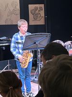 Props voor begeleidster van dienst, Dorenda Notermans, die de leerlingen muzikaal ondersteunde en op koers hield.