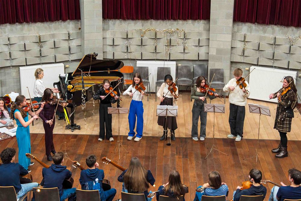 De theaterklassen van Lize Theunis brachten verschillende komische en feestelijke scènes die perfect pasten bij de sfeer van de avond. Maar ook de leerlingen muzikale vorming, viool, cello, hoorn, hobo, gitaar en groepsmusiceren strooiden feestelijke klanken in het rond.