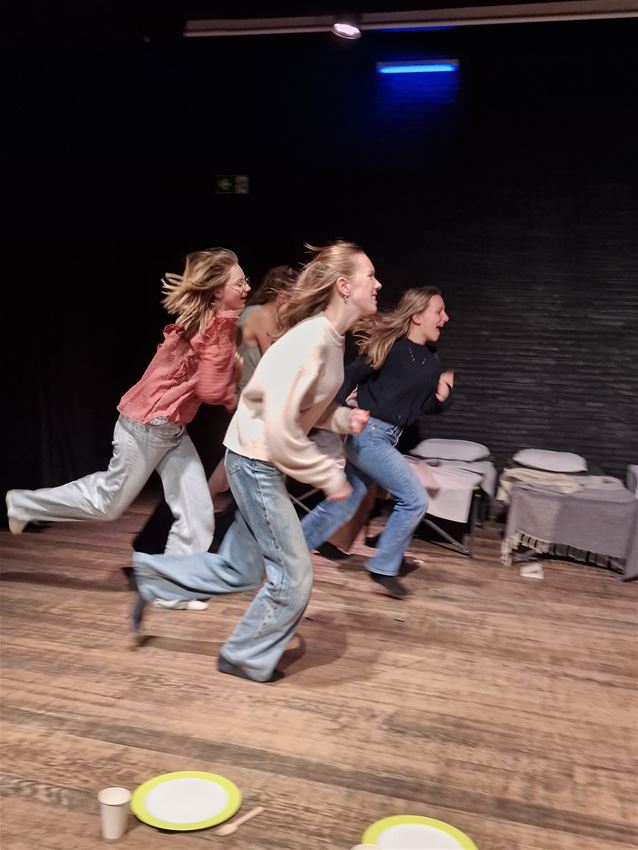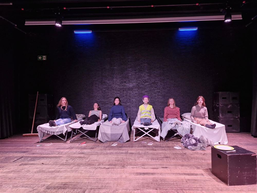 Bij binnenkomst in de zaal werden de toeschouwers verwelkomd door een duistere setting: een donkere ruimte met mysterieuze muziek, waarin zes bedden stonden met zes meisjes erop. Hiermee werd de toon meteen gezet voor het stuk ‘Als de vogels niet meer fluiten’, een aangrijpend verhaal dat de aandacht van het publiek onmiddellijk wist vast te houden.