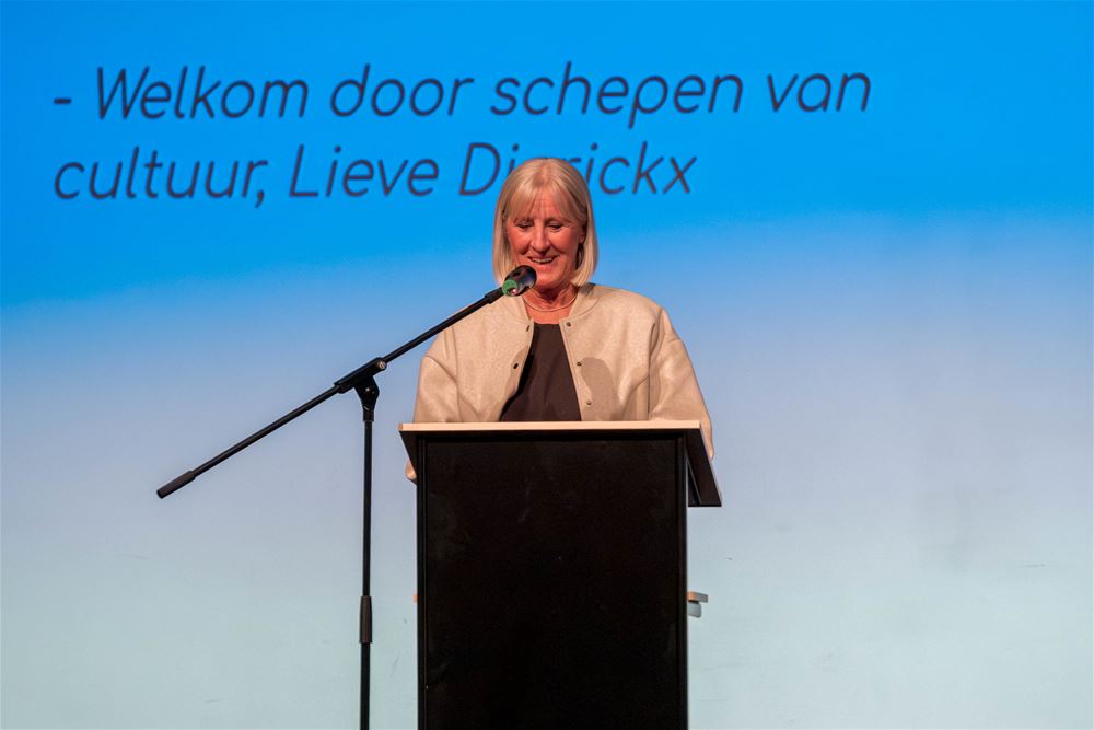 Het publiek nam plaats tussen deze twee podia en werd verwelkomd door theaterdocent Wouter Fimmers. Hij gaf al snel het woord door aan schepen Lieve Dierickx. Daarna volgden de optredens elkaar aan weerskanten in een vlot maar aangenaam tempo op.